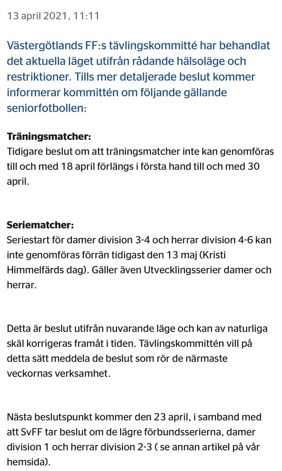 Info från VFF! Västergötlands Fotbollförbunds tävlingskommitté har den 19 mars fattat beslut om seriestart 2021. Beslutet förutsätter naturligtvis att riktlinjer och restriktioner så tillåter och kan ändras under tiden fram till nu planerat startdatum. Ytterligare två alternativ presenterades den 14 mars och finns i annan artikel på hemsidan. Dessa alternativ är fortfarande aktuella om nuvarande planering inte håller. Serierna startar helgen 1-2 maj, med tillägget att matcher 29-30 april som tillhör aktuell omgång också kan spelas enligt planering. Detta alternativ har Svenska Fotbollförbundet fastställt för de lägre förbundsserierna, damer division 1 samt herrar division 2 och 3. De två första spelomgångarna i damer division 3 samt herrar division 4 och 5 skjuts upp så att omgång 1 spelas omkring 7 juli och omgång 2 efter sista ordinarie omgång, dvs 9-10 oktober. Avvikelser kan förekomma i vissa serier. VFF återkommer under vecka 12 med information Trässbergs BK 19 mar 2021 0kommentarer